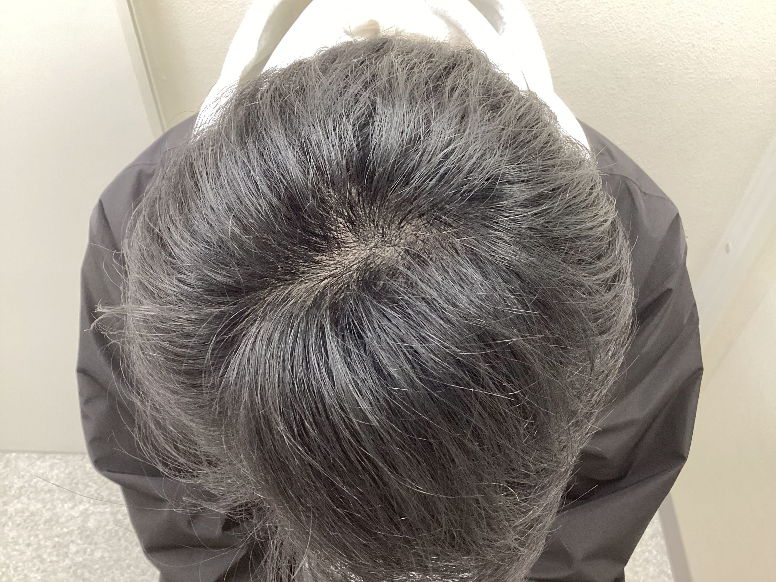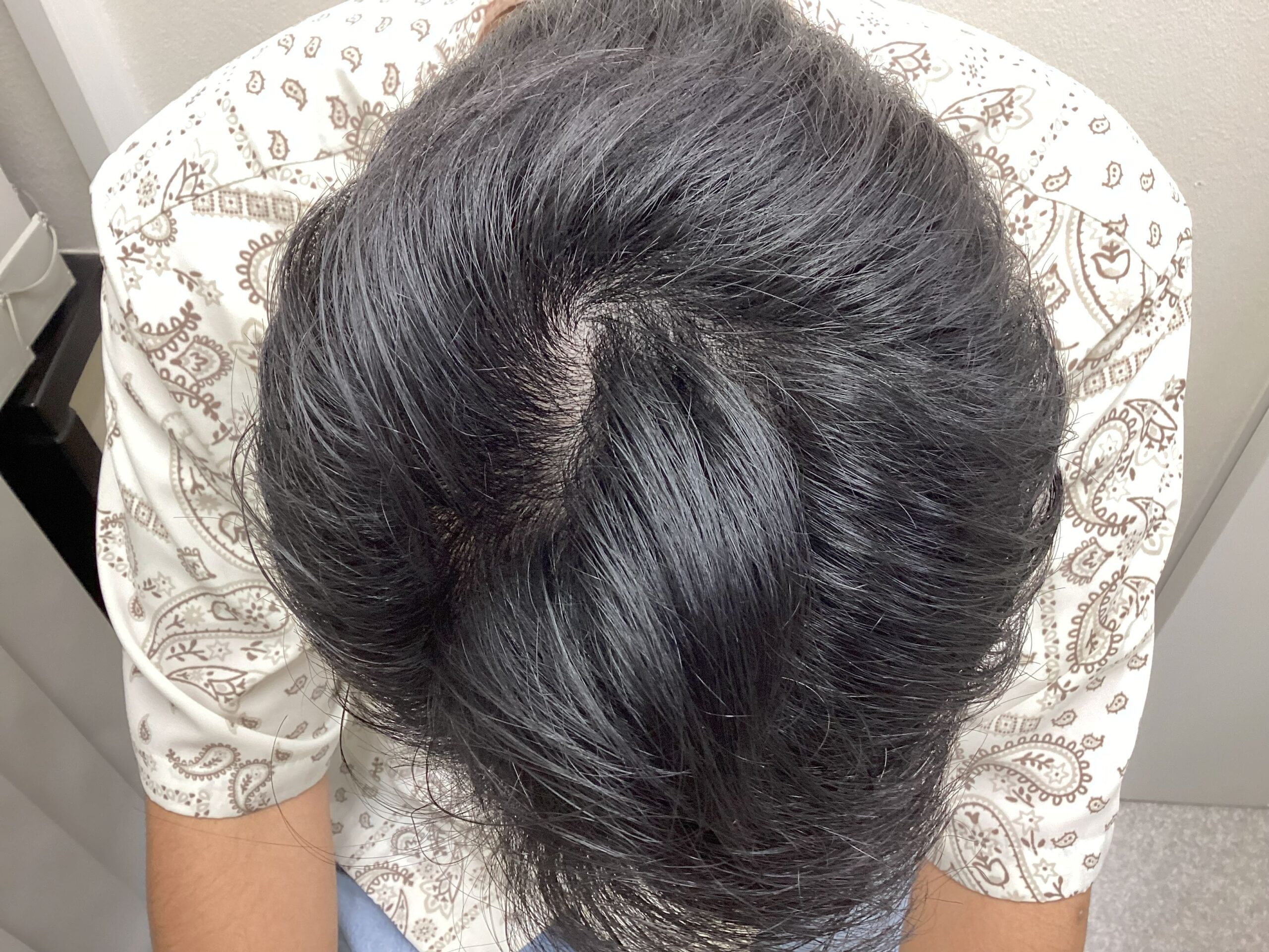 頭頂部も全体的に発毛が見られ、軟毛化していた髪質もコシのあるしっかりとした毛が増え、ボリューム感があり透け感が無くなっております。