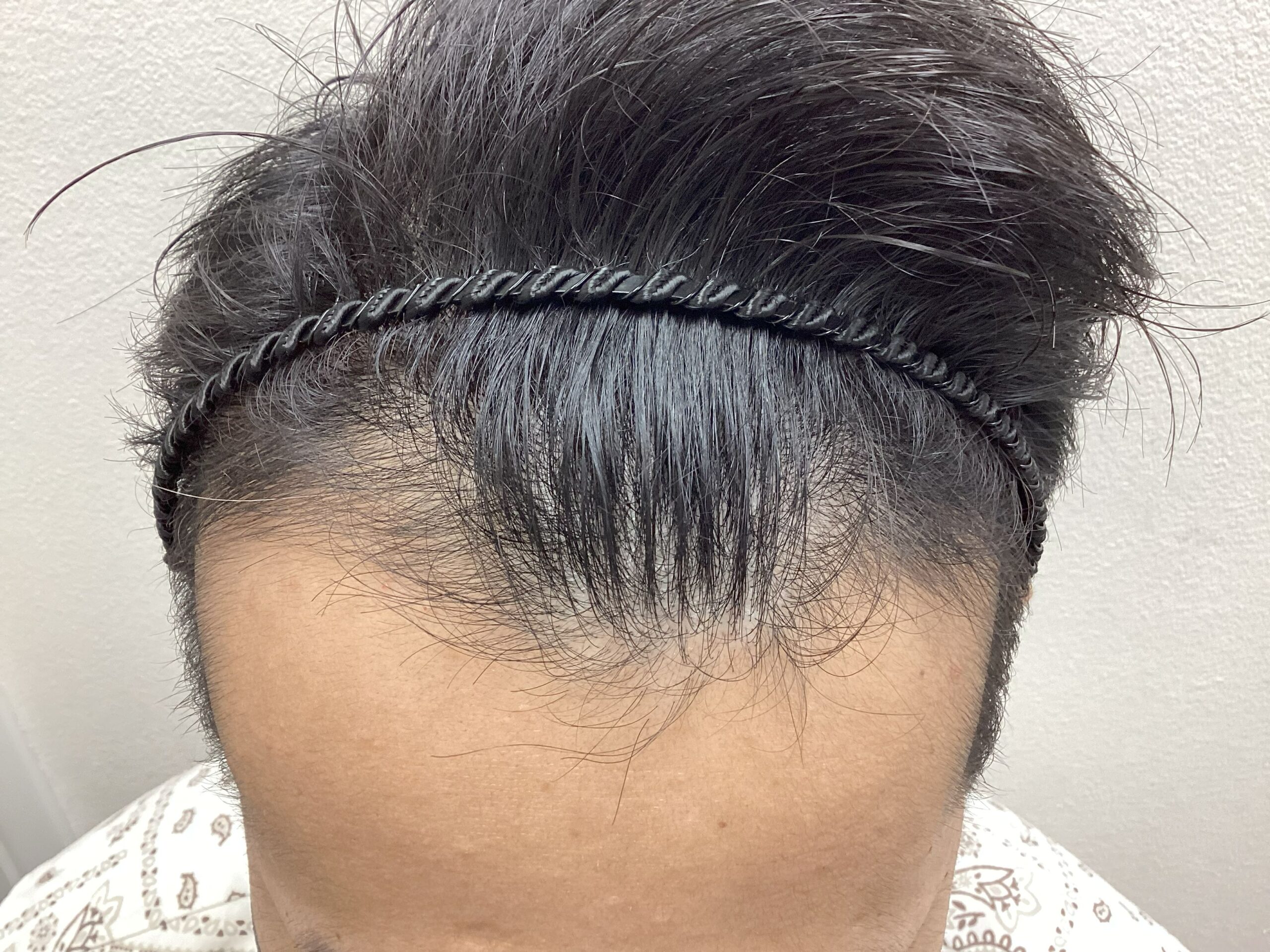 生え際は、深さのあるM字から太さのある毛が発毛しており、生え際が前進しおでこの範囲が狭くなっております。